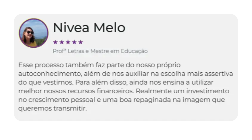 Estrategista de imagem, consultora de estilo, coach e analista comportamental. Especialista em análise corporal pelo sistema Kibbe Body Types, visagismo, tecidos, coloração pessoal e comportamento de compra. Já realizei mais de 10 formações na área da moda e imagem e mais de 1.000 alunas impactadas pelos meus cursos, mentorias e consultorias individuais.